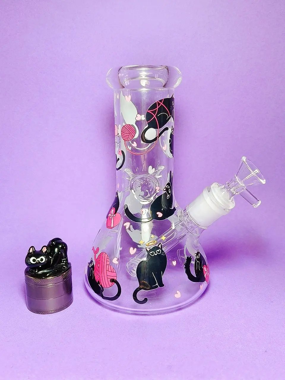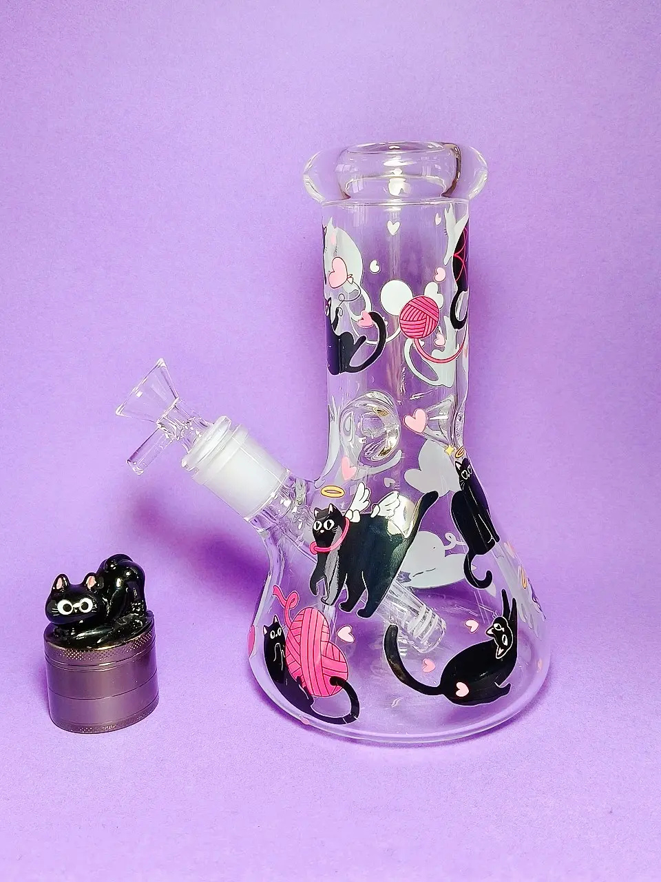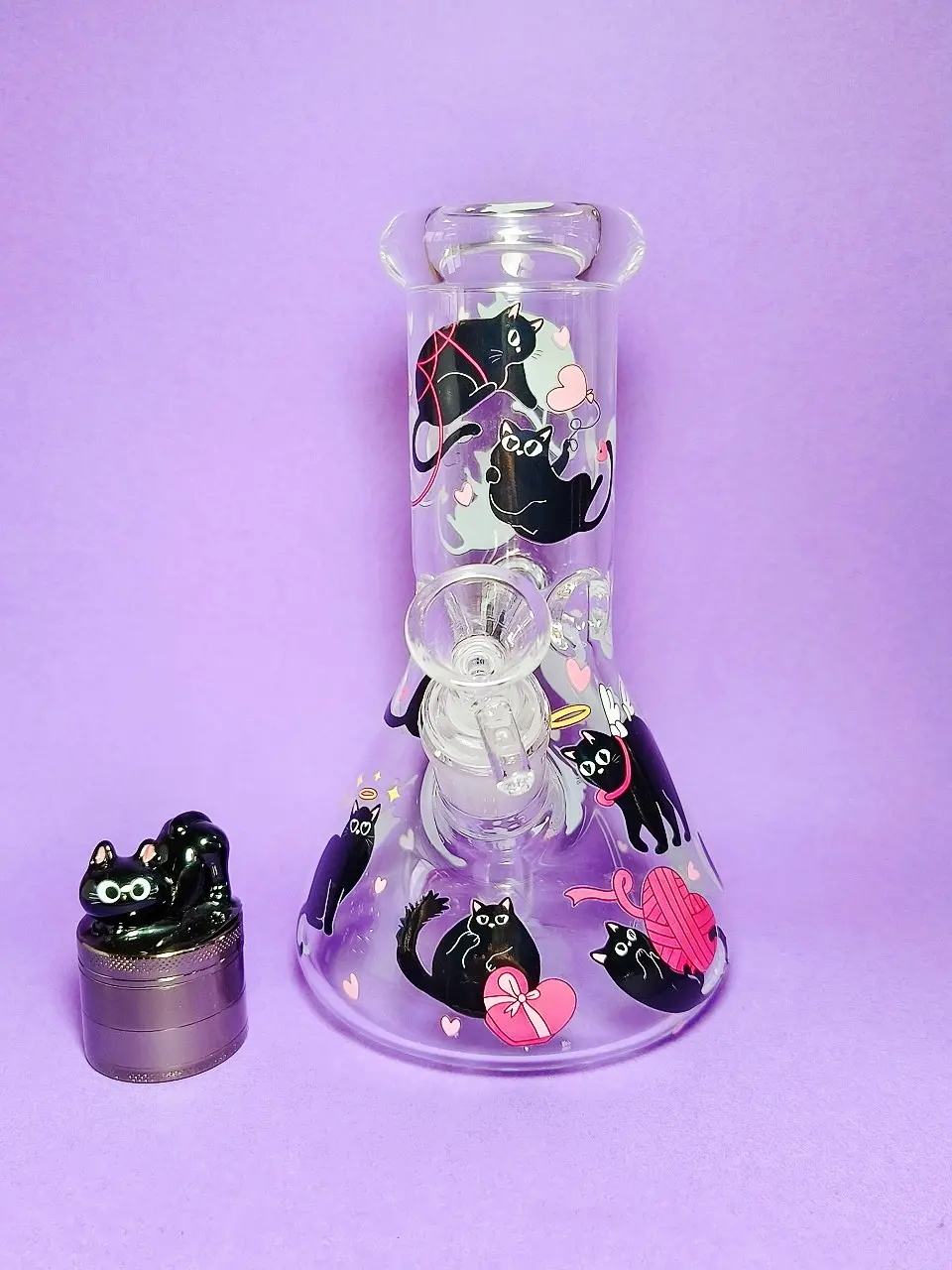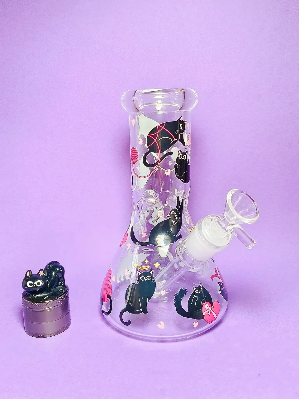 The bong can be purchased on its own, or you can add a matching smaller black cat grinder at a discounted price to create a complete themed set.