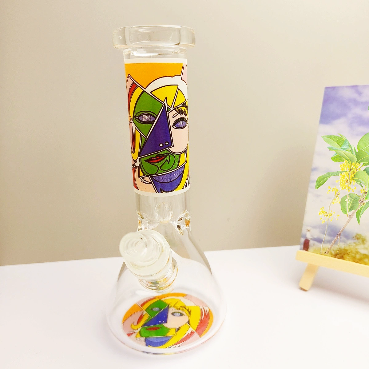 Its clear body showcases a bold, abstract face design inspired by Picasso, with vibrant colors and striking lines that echo each other between the neck and base.