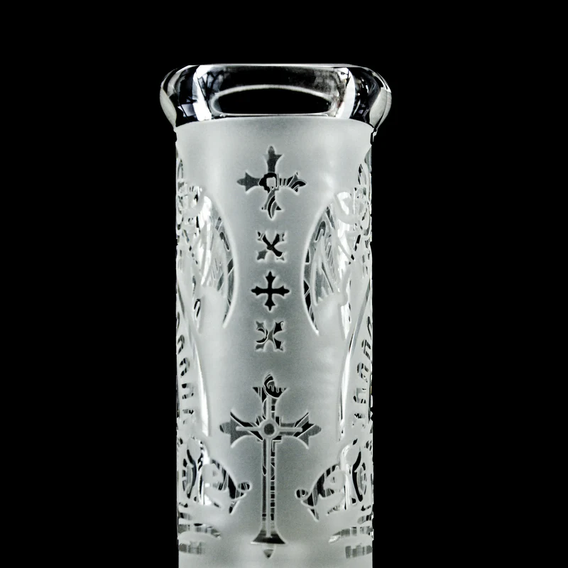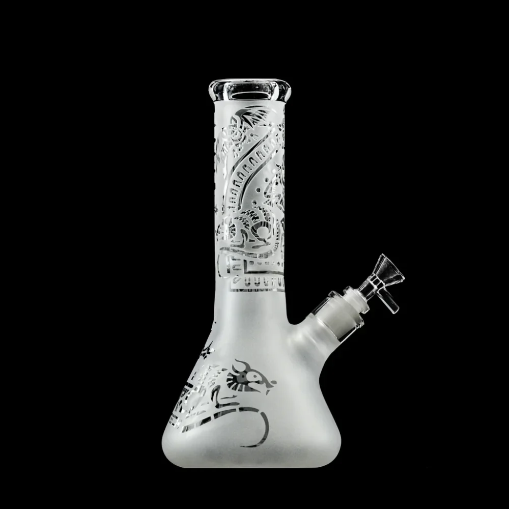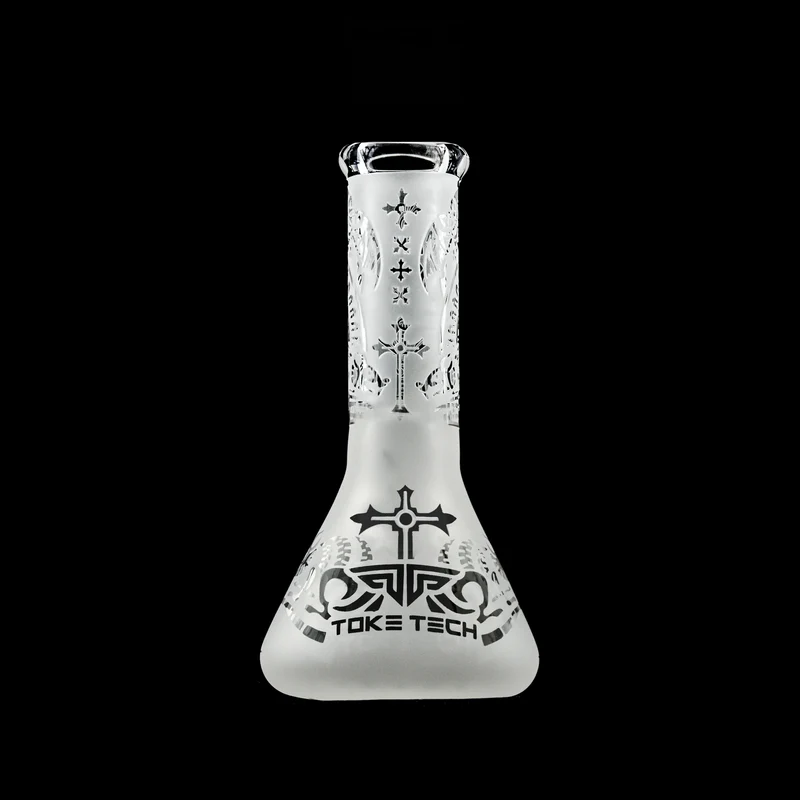 This 9 Inch Toke Tech Beaker Bong is more than just glass—it’s a statement. Featuring sandblasted artwork with deep, intricate designs, this piece captures a dark and edgy aesthetic that stands out from the rest. Whether it’s the tribal masks or gothic cross patterns, each detail adds attitude and personality.