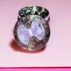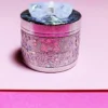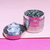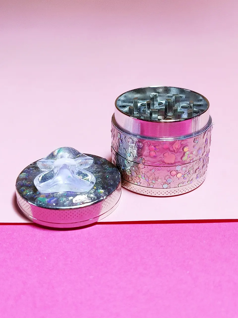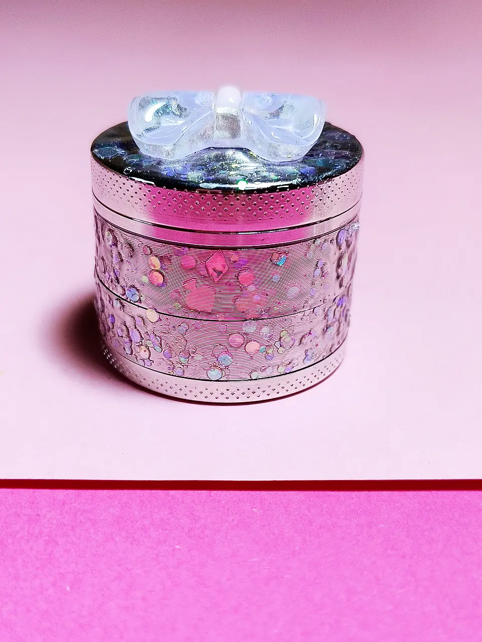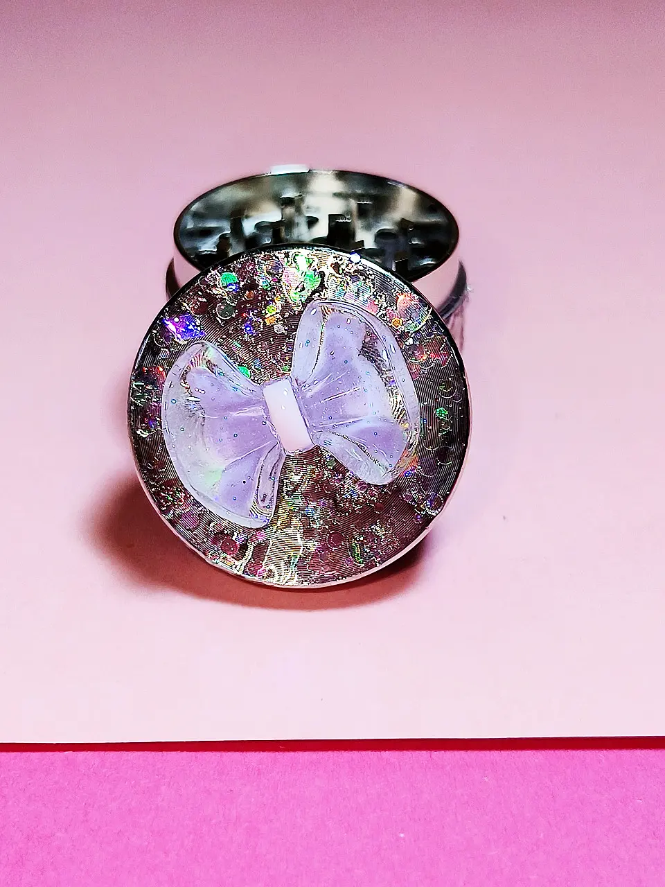 This charming metal grinder combines functionality with a touch of whimsical elegance. Its most striking feature is the dazzling top, adorned with a spectrum of iridescent glitter that catches the light beautifully. Central to this glittery canvas is a delicate, translucent lavender bow, adding a sweet and unique aesthetic that sets it apart from typical grinders. The overall appearance is eye-catching and playful, perfect for those who appreciate both utility and a bit of sparkle.